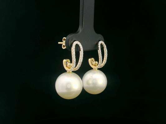 18K Gold South Sea Pearl & Diamond Drop Earrings – 9x13mm Pearls