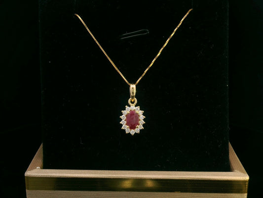 18K Yellow Gold Ruby & Diamond Halo Pendant – 0.74ct Oval Ruby, 0.20ct Diamonds