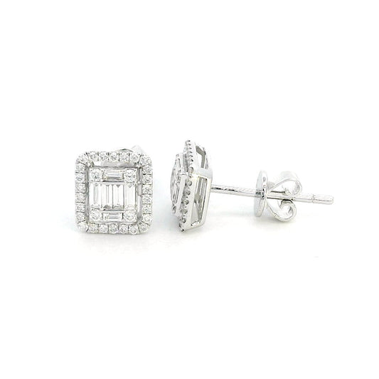 18K Gold Earrings with Round and Baguette Diamonds Framed by a Halo – 0.46 Carats