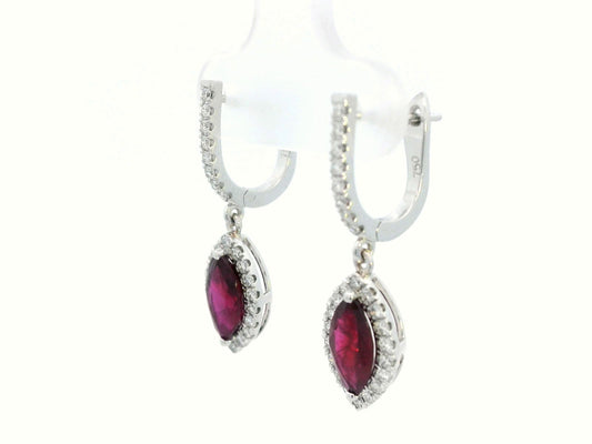 18K Gold Marquise Ruby and Diamond Halo Drop Earrings - 1.72ct Ruby