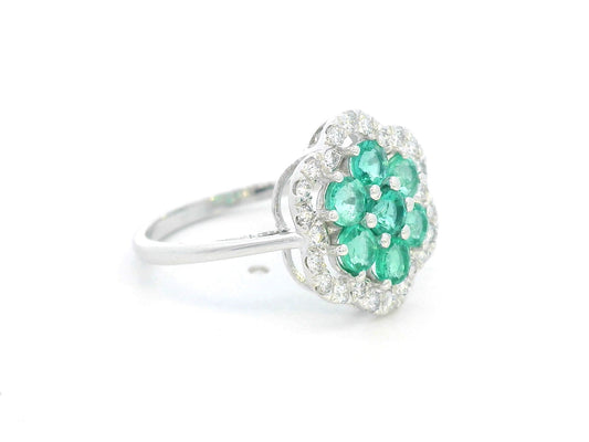 Floral Emerald and Diamond Ring in 18K Gold – 1.00ct Emerald Cluster, 0.34ct Diamond Halo