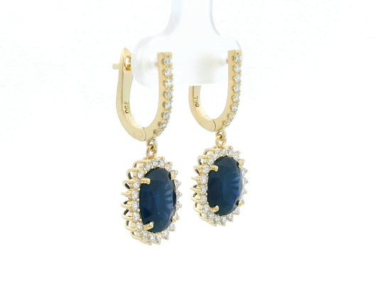 18K Gold Blue Sapphire and Diamond Drop Earrings – 0.98ct Oval Sapphires & 0.26ct Diamond Halo Hoops