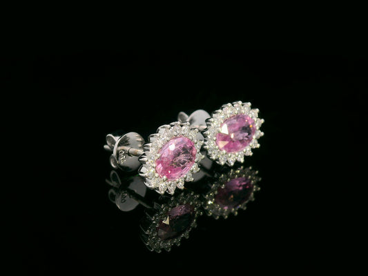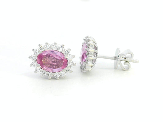 18K Gold Oval Pink Sapphire Earrings with Diamond Starburst Halo