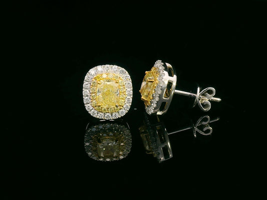 18K Gold Fancy Yellow Diamond Halo Stud Earrings | 1.18 Carat Center Stones
