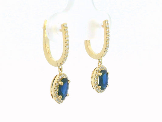 18K Yellow Gold Oval-Shape Blue Sapphire With Sunburst Halo Drop Earrings