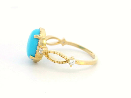 18K Gold Oval Turquoise Ring with Diamonds – Vintage Milgrain Design