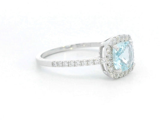 18K White Gold Cushion-Cut Aquamarine Ring With Diamond Halo.