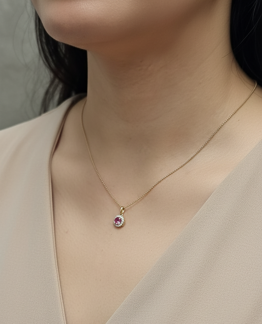Pink Sapphire & Diamond Halo Pendant in 18K Yellow Gold