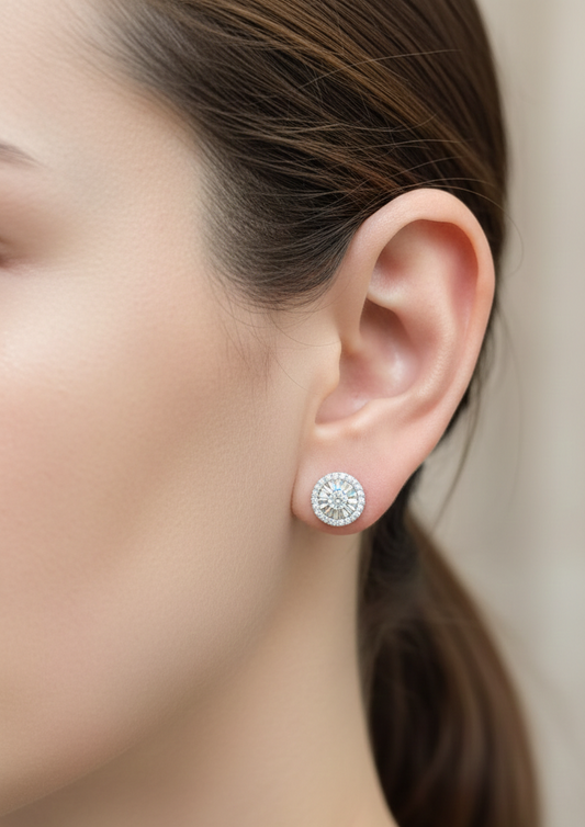 Diamond Cluster Stud Earrings with Miracle Plate & Halo in 18K White Gold
