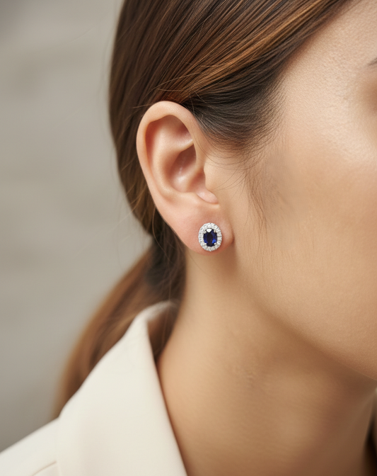 Blue Sapphire & Diamond Halo Stud Earrings in 18K White Gold