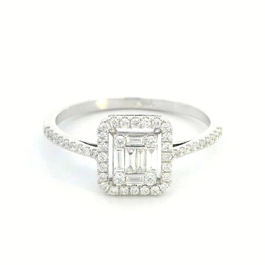 Emerald-Shaped Cluster Engagement Ring in 18K White Gold | 0.34 Carats of Round and Baguette Diamonds