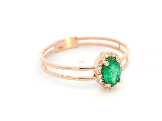 18K Rose Gold Double-Band Oval Emerald Halo Ring – 0.40 Carat Emerald & 0.05 Carat Diamonds