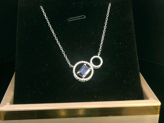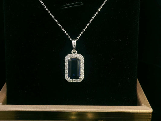 18K White Gold Emerald-Cut Sapphire & Diamond Halo Necklace – 0.65 CT Sapphire, 0.15 CT Diamonds