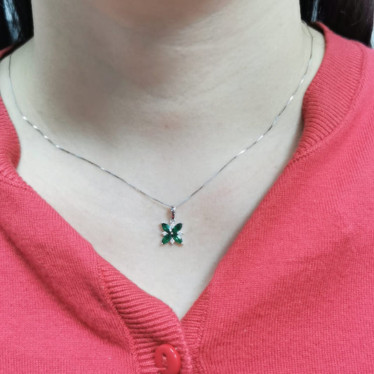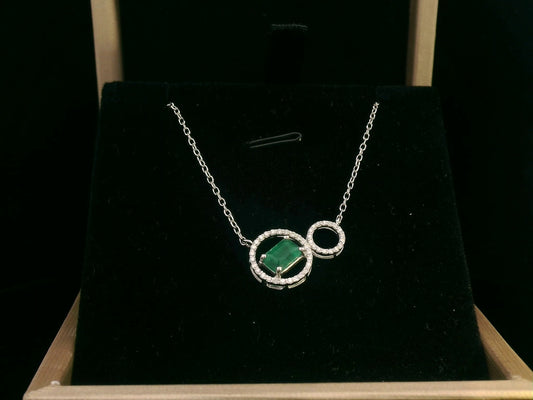 18K White Gold 0.63ct Emerald-Cut Emerald & 0.15ct Diamond Double Circle Necklace – Modern & Elegant