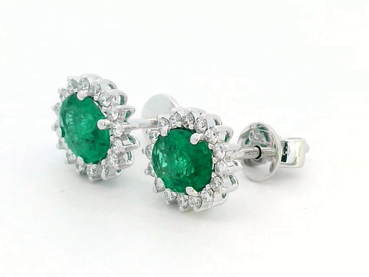 Oval Emerald Stud Earrings With Diana-Inspired Halo In 18k Gold