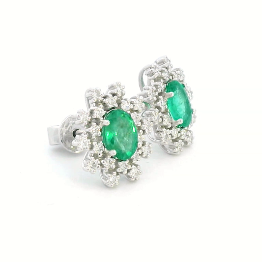 18k White Gold Oval Emerald and Diamond Starburst Stud Earrings.