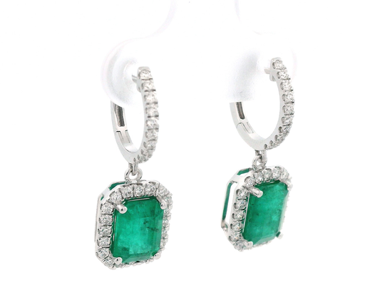 Elegant 18k White Gold Emerald & Diamond Drop Earrings