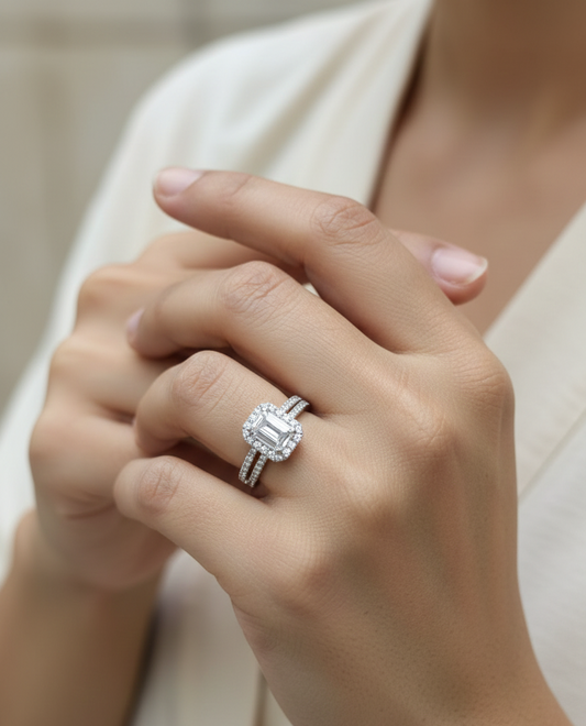 Emerald-Cut Diamond Bridal Set in 18K White Gold – 0.90ct Center Diamond