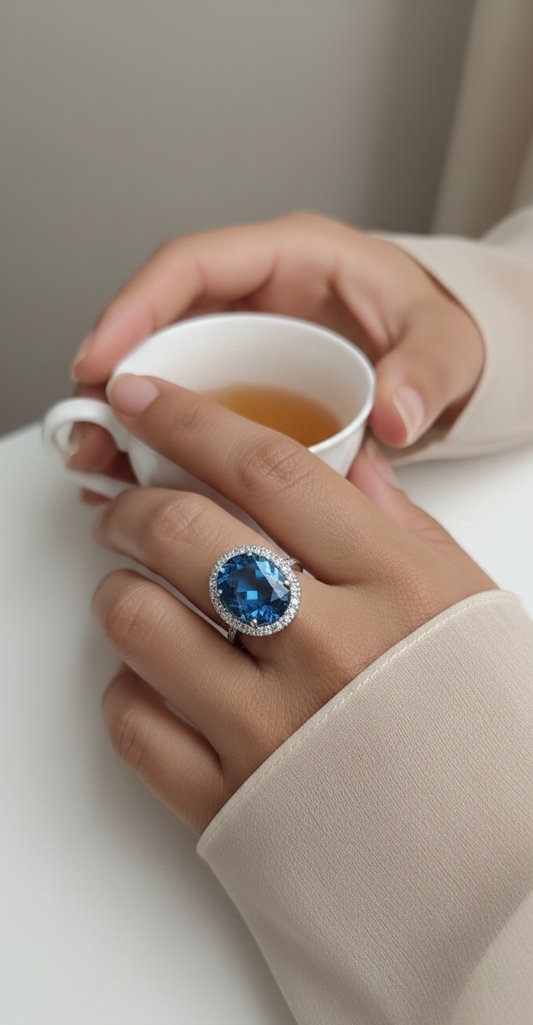 London Blue Topaz & Diamond Halo Ring in 18K White Gold – 9.15ct Oval Topaz