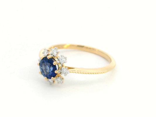 18K Gold Round Sapphire & Diamond Sunburst Ring – 0.79 CT Sapphire, 0.15 CT Diamonds