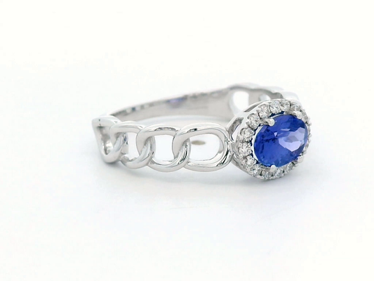 18K White Gold Oval Tanzanite and Diamond Halo Ring