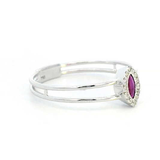 Elegant 18K Gold Ruby and Diamond Halo Ring – Marquise-Cut Ruby with Split Band