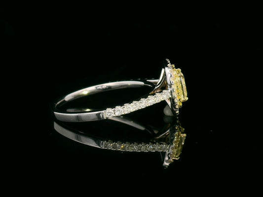 Fancy Yellow Diamond Engagement Ring in 18K White Gold | Cushion Cut Center Stone with Double Diamond Halo