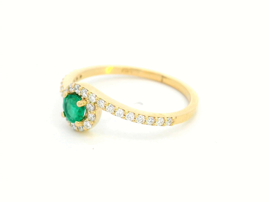 18K Yellow Gold Emerald and Diamond Halo Ring | 0.22 Carat Round Emerald with 0.25 Carat Diamonds