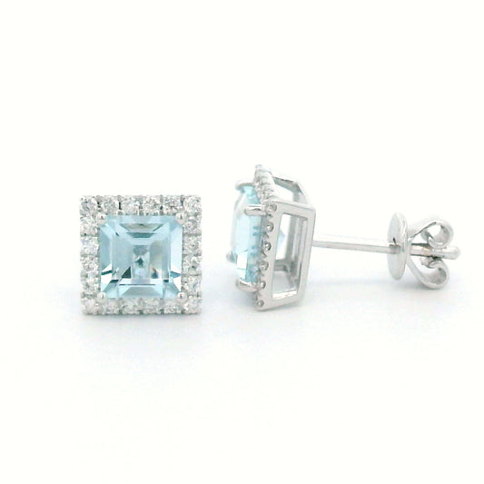 1.62 Carat Aquamarine With Diamond Halo Stud Earrings In 18k White Gold.