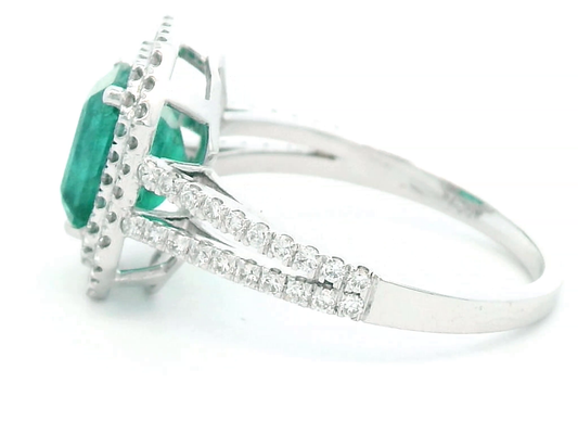 18k Gold Emerald Cut 1.85 Carat Emerald Ring with 0.55 Carat Double Diamond Halo and Split Band