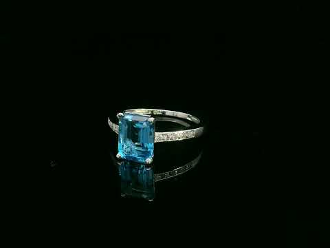 Swiss Blue Topaz & Diamond Ring in 18K White Gold – Emerald Cut Topaz Ring