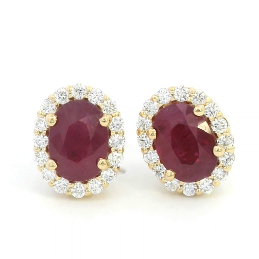 Oval Ruby With Diamond Halo Earrings In 18k Yellow Gold.