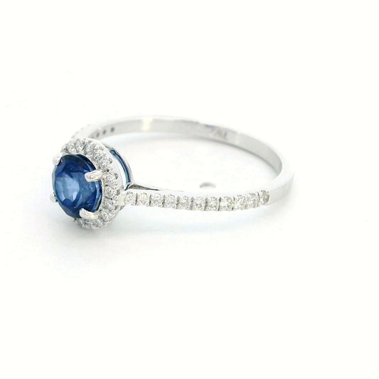 Round Cut Sapphire and Diamond Halo Ring in 18K White Gold | 0.94 Carat Sapphire & 0.24 Carats Diamonds