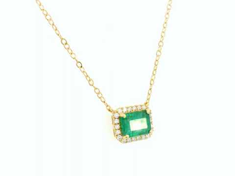 18K Yellow Gold Emerald-Cut Emerald Necklace with Diamond Halo