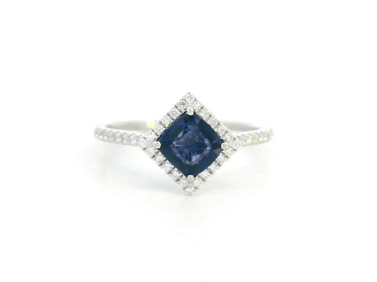 Cushion cut Blue Sapphire Ring with Diamond Halo in 18k White Gold