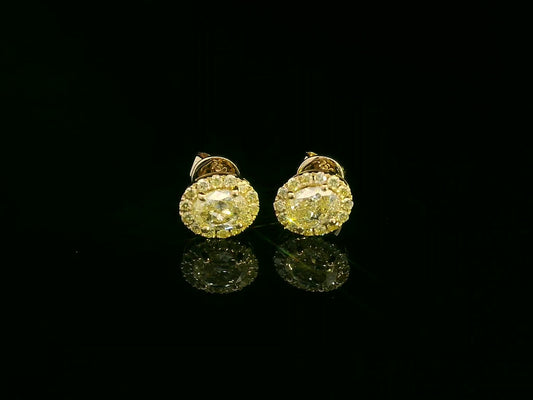18K Yellow Gold Halo Stud Earrings with 0.86 Ct Oval Fancy Yellow Diamonds