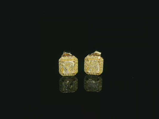 18K Yellow Gold Halo Stud Earrings, With Fancy Yellow 0.90 Ct Radiant-Cut Diamonds with 0.13 Ct Halo