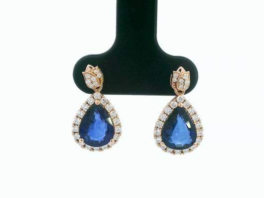 18K Rose Gold Pear-Shaped Blue Sapphire Earrings with Diamond Halo