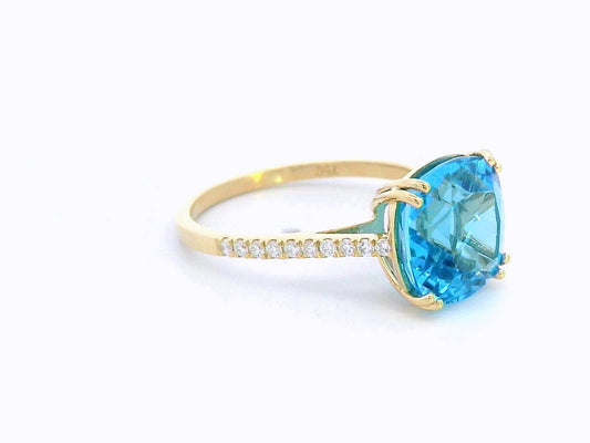 18K Yellow Gold Cushion-Cut Swiss Blue Topaz and Diamond Ring