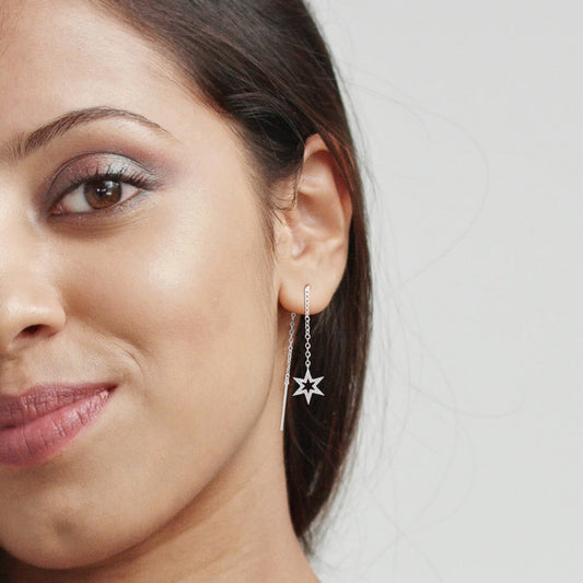 Needle And Thread Earrings With Diamond Open Star In 18k White Gold.