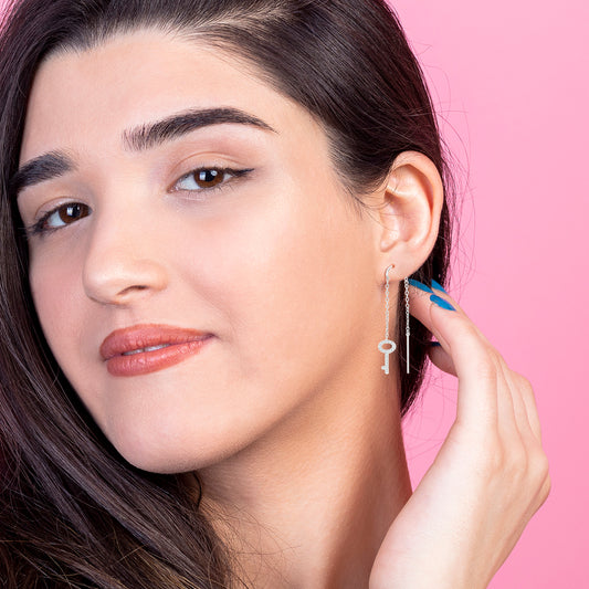 Needle And Thread Earrings With Diamond Key Charms In 18k White Gold.