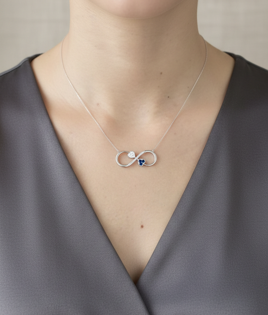 Diamond & Blue Sapphire Infinity Heart Necklace in 18K White Gold