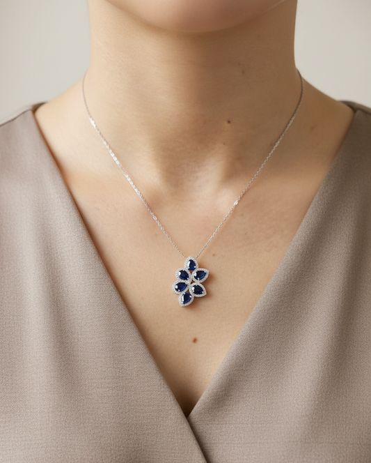 Blue Sapphire & Diamond Cluster Necklace in 18K White Gold