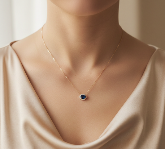 Blue Sapphire & Diamond Halo Necklace in 18K Yellow Gold