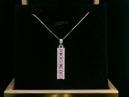 18K White Gold princess-Cut Pink Sapphires & Diamond Pendant.