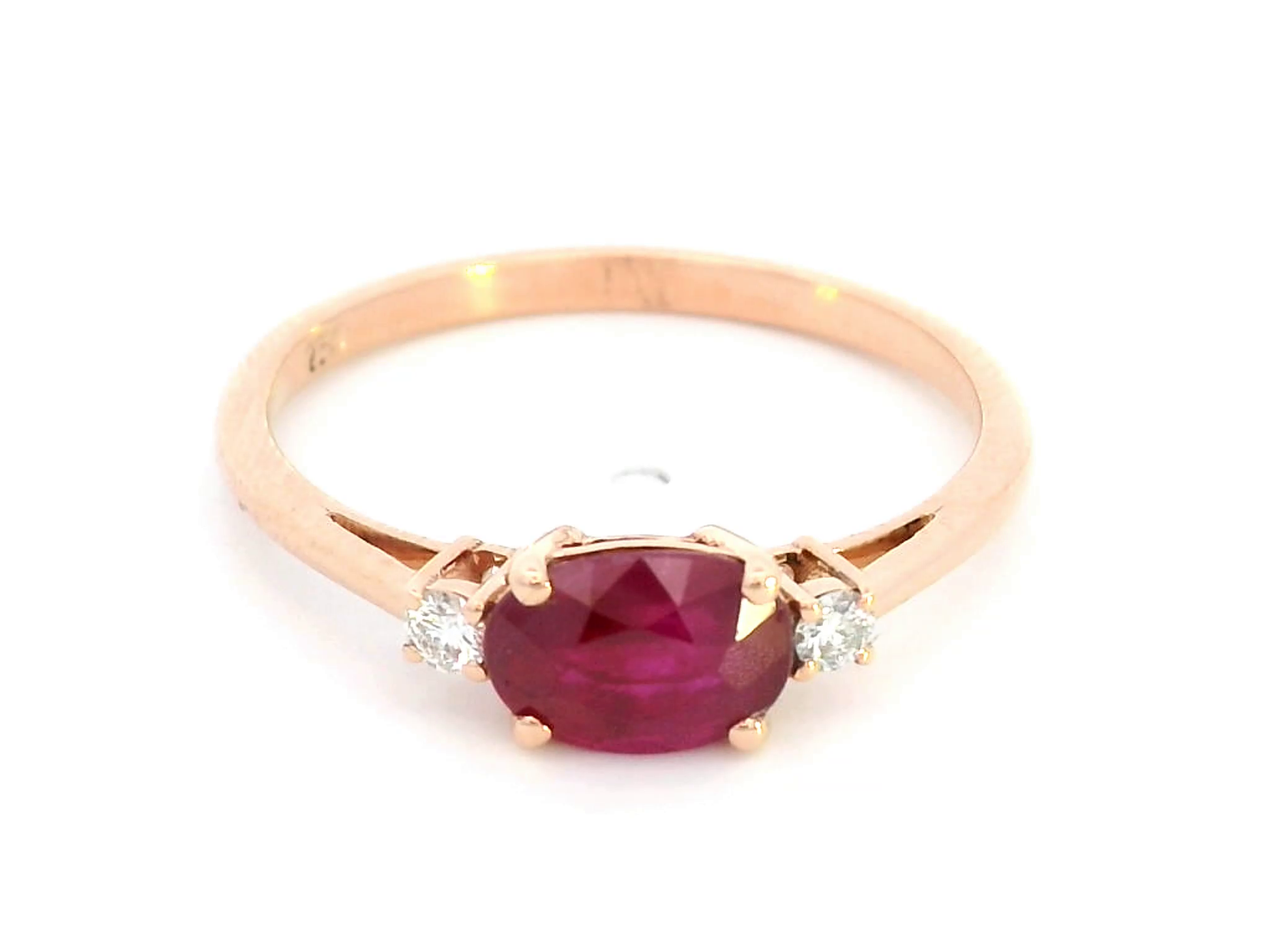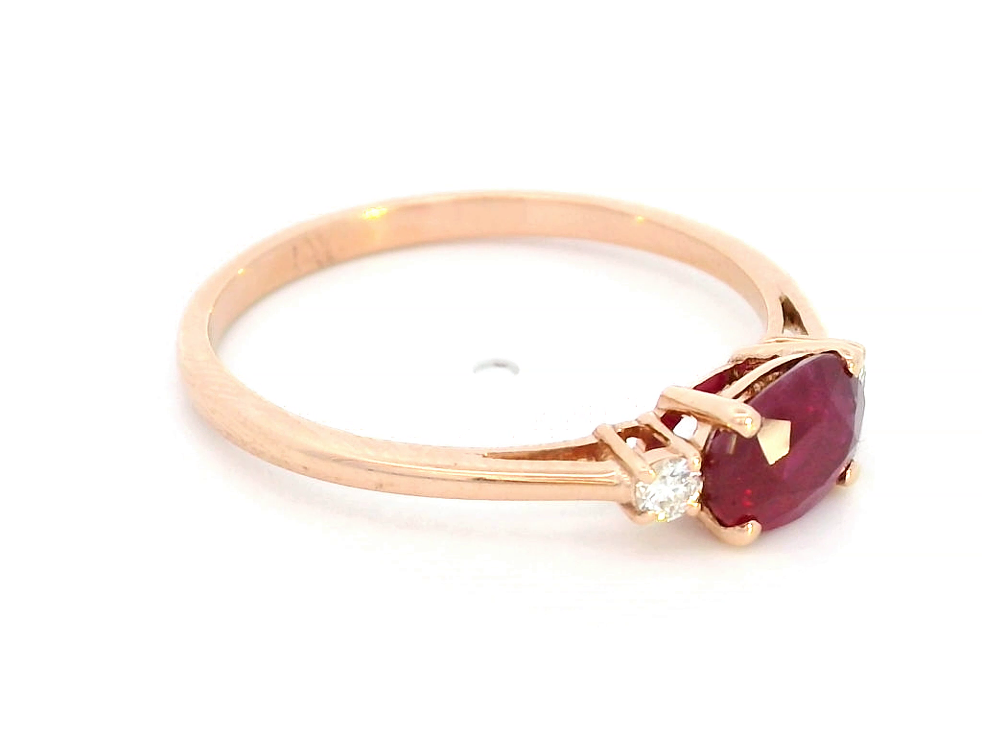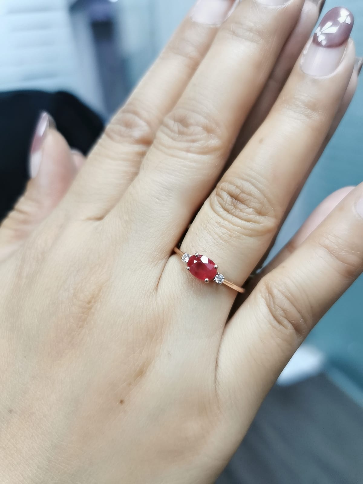 This elegant 18K gold ring is centered with a 1.06-carat oval-cut ruby, flanked by two brilliant diamonds on either side, totaling 0.06 carats. The rich red hue of the ruby paired with the subtle sparkle of the diamonds creates a timeless piece that exudes sophistication and grace. Perfect for both special occasions and everyday wear, this ring is a true testament to luxury.