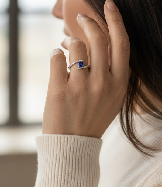Blue Sapphire & Diamond Bypass Ring in 18K White Gold