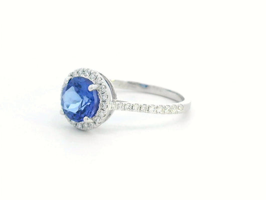 1.55 Carat Round Tanzanite & Diamond Halo Ring in 18K Gold