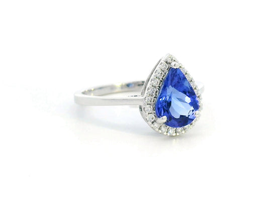 18K Gold, Pear-Shaped Tanzanite with Diamond Halo Ring
