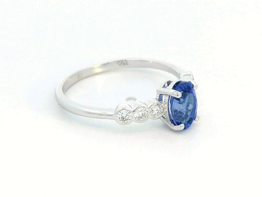 Oval Tanzanite and Diamond Ring in 18K White Gold – Elegant Bezel-Set Side Stones
